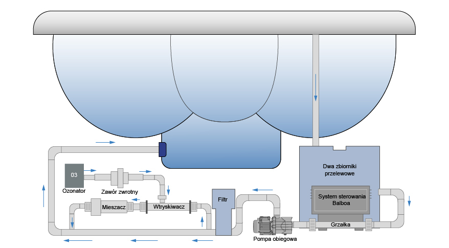 - Jakość wody: dzięki zastosowaniu ozonatora oraz odpowiedniej chemii (chlor lub brom), woda zachowuje czystość nawet do 120 dni.