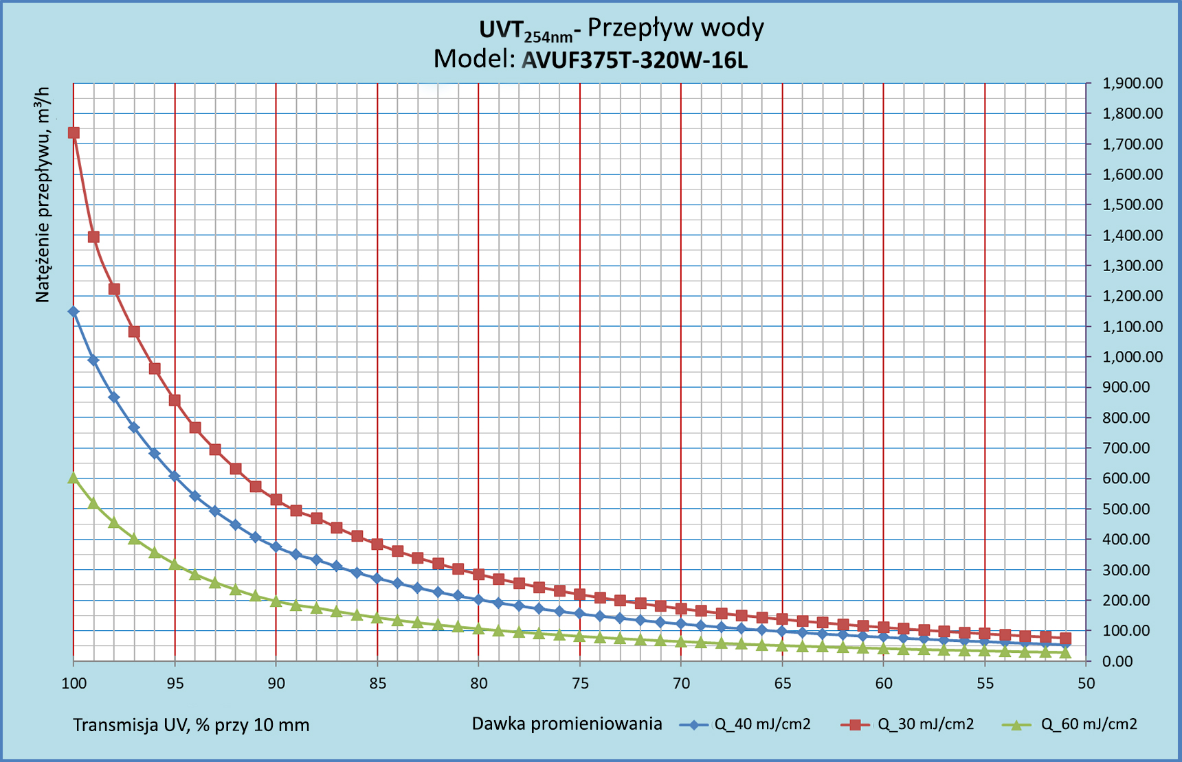 - Przepływ: 300 m³/h (przy dawce 40 mJ/cm²)