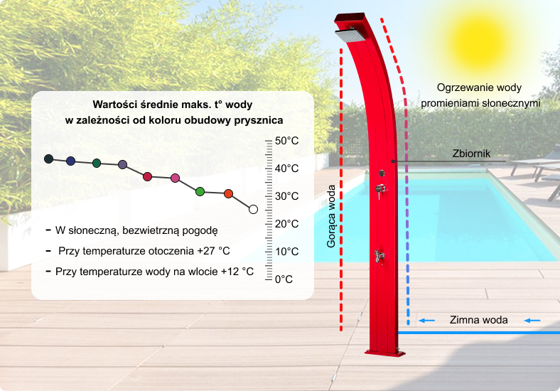 Obudowa prysznica jest zbiornikiem o pojemności 25 litrów. Nie wymagana podłączenia do prądu ani CWU. Woda podgrzewa się w sposób naturalny, gdy na obudowę prysznica pada bezpośrednie światło słoneczne.