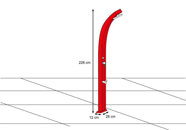 Prysznic wyposażony jest w zbiornik o pojemności 25 litrów, baterię oraz kranik do mycia stóp. Dzięki kompaktowym wymiarom prysznic z łatwością wpasuje się w nowoczesny krajobraz. Możesz go zamontować na terenie basenu, łaźni lub na plaży.
